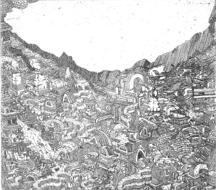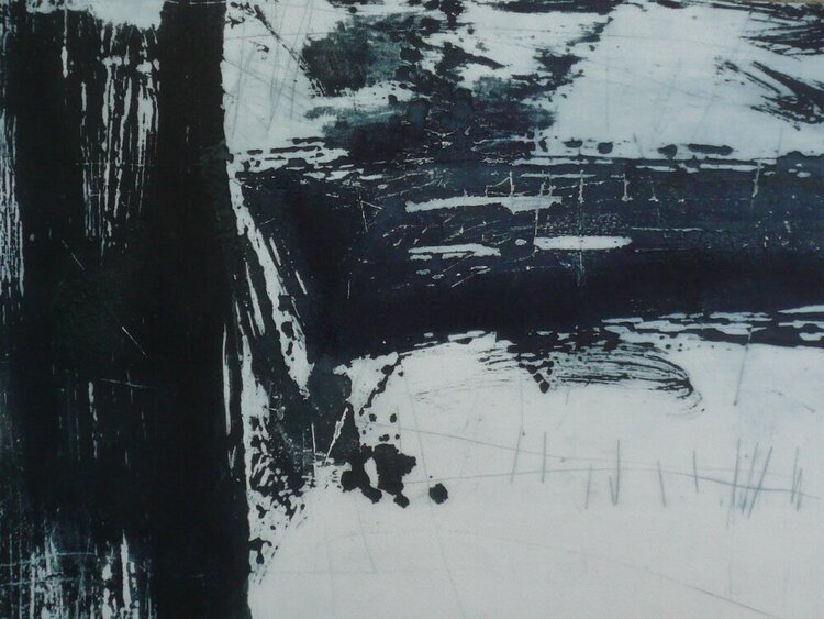 Intaglio printing uses various methods of 'cutting' and image onto the surface of a metal plate. Once the plate is inked, the incised lines hold the ink whilst the rest of the plate is wiped clean. The plate, in contact with damp paper, is passed through a roller press under pressure. The paper is forced into the sunken areas to receive the ink.The inked lines on the finished surface are often slightly raised and there is generally a visible line around the image where the plate has been pressed into the paper, called the platemark. The presence of a platemark is a good way of telling an intaglio print from a relief or planographic print. Engraving, etching, drypoint, carborundum, aquatint and mezzotint are the most common types of intaglio printmaking. Many printmakers combine different intaglio techniques when they work on their plates and for this reason it is not unusual to see a contemporary print described simply as intaglio.