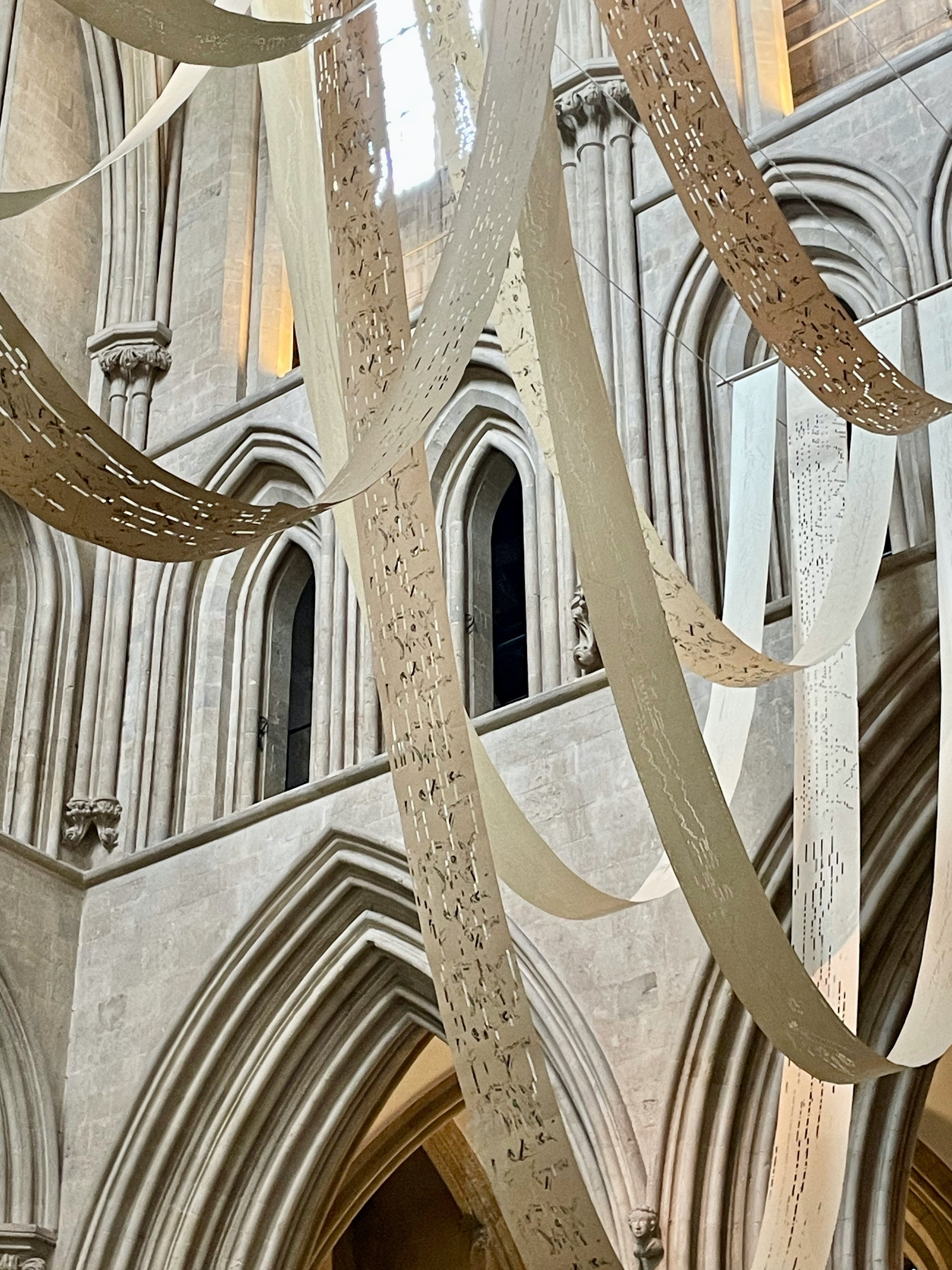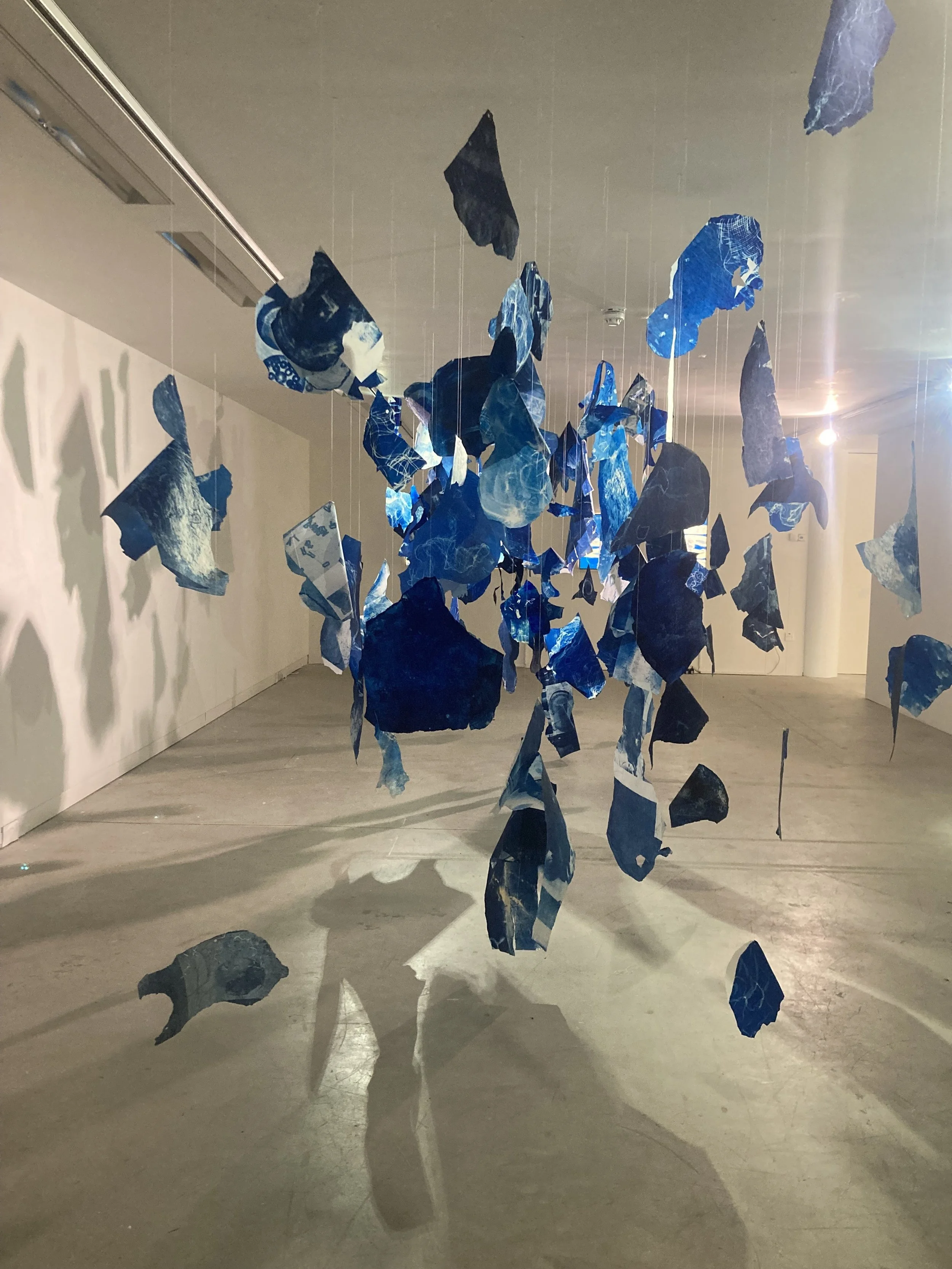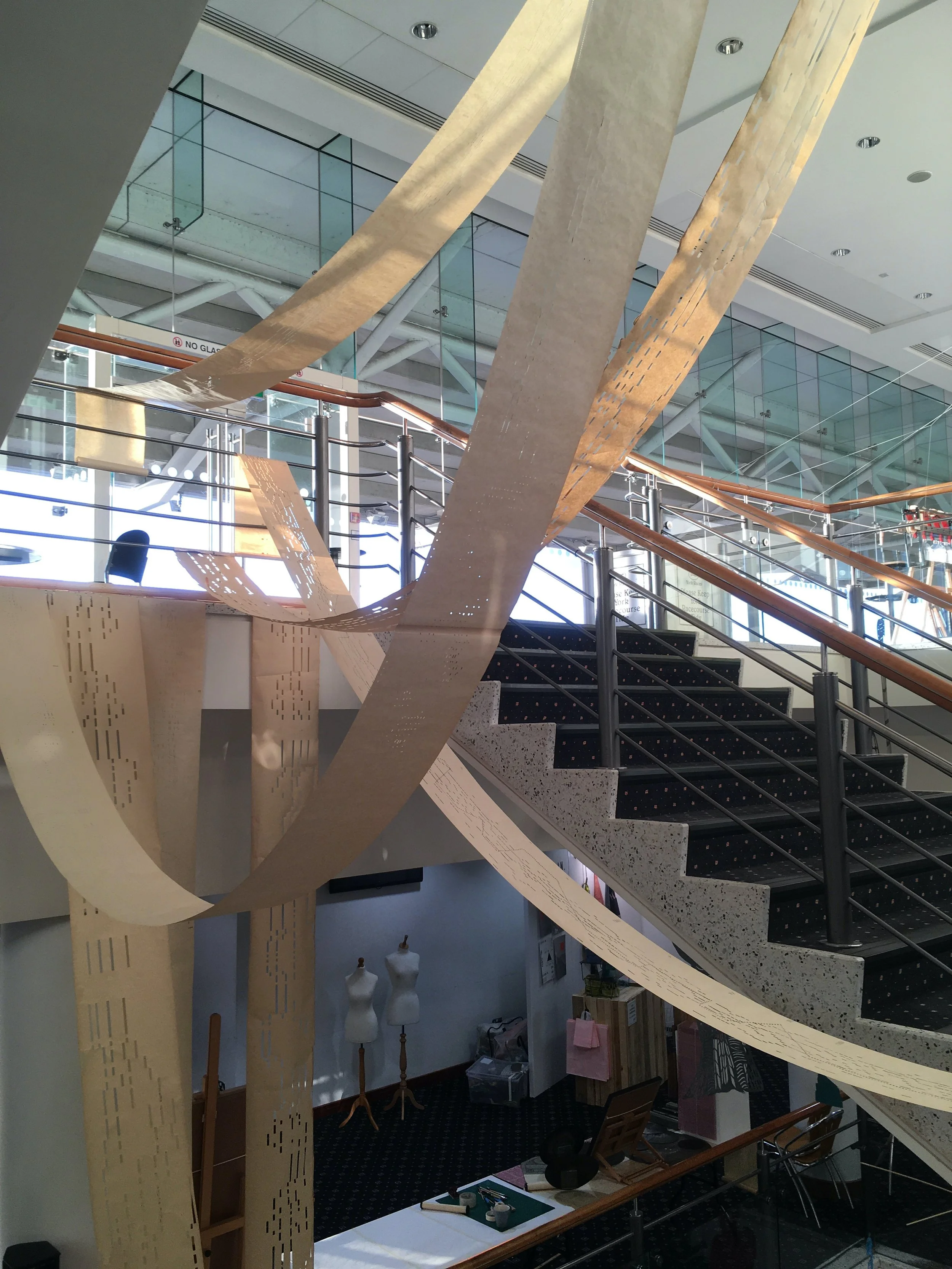 The ‘confetti’ motif, screen printed across the surface of the installation piece was inspired by stories of how the ‘punched out’ physical waste from computer punch cards was used as confetti by company employees in the mid-twentieth century. The traditional analogue printmaking processes she employs echo the labour inherent in the making of these materials, while the binary language of the machine dances in rhythmic patterns through her work as a signifier of our digital age.