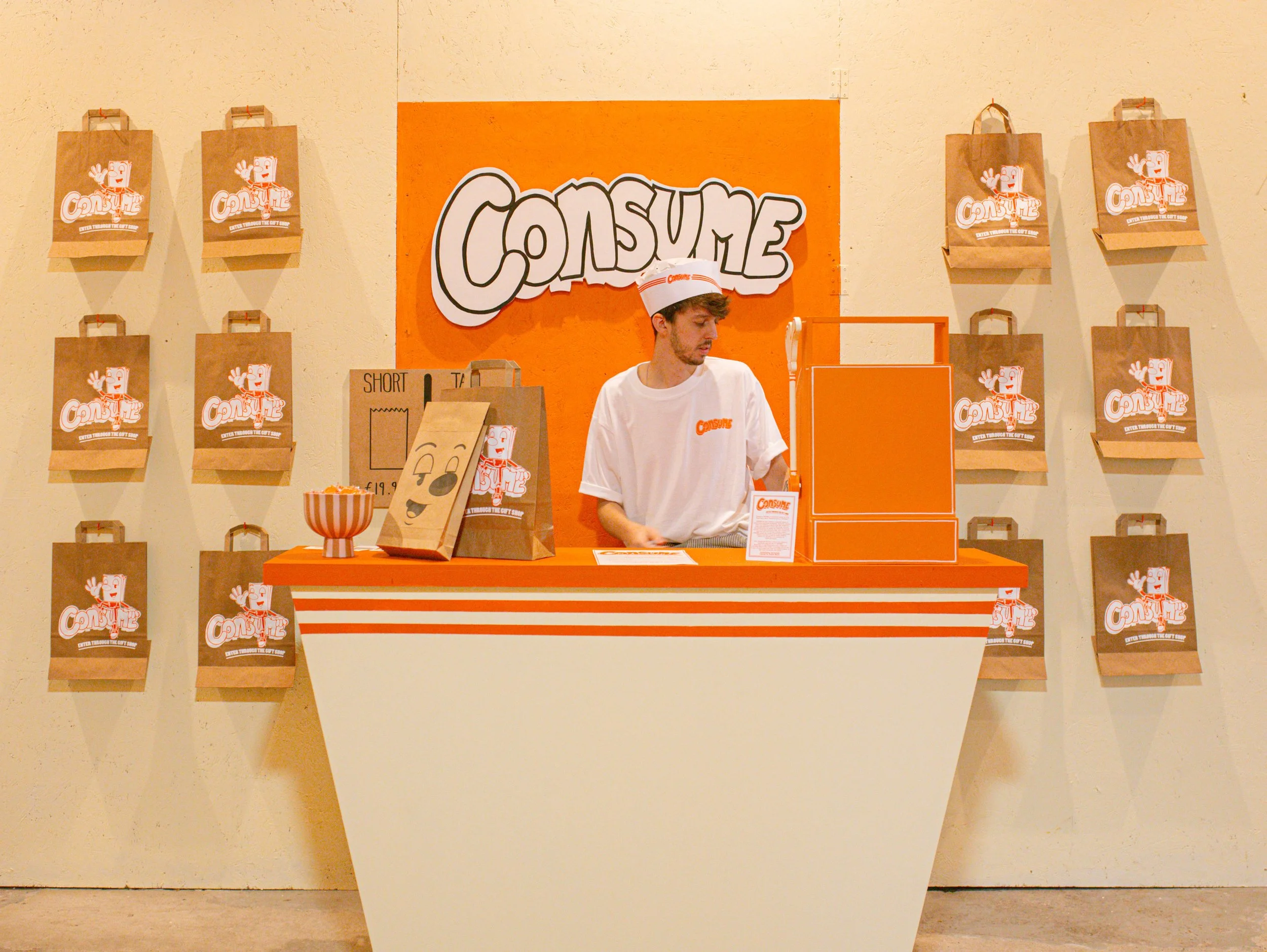 CONSUME was created in response to contemporary commercialism and brand idolisation, combining visual aspects of consumer culture from both