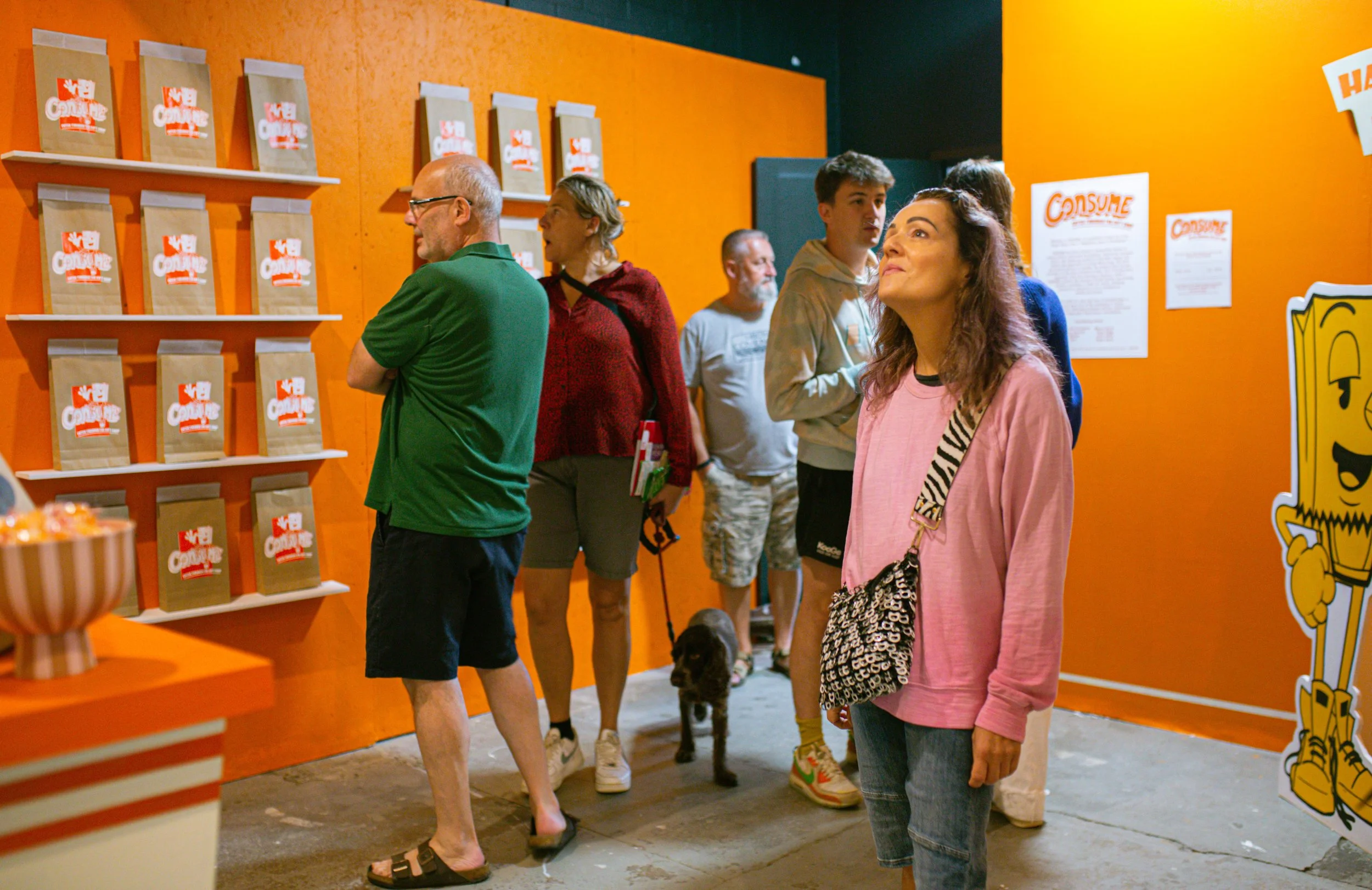 ‘Enter Through the Gift Shop’ is an immersive art installation confronting a world where name and logo have become commodified and worshipped. Whether a statement of wealth, success or obsession, has the 'Brand' become more important than what it is stamped onto? The repeated tautological use of brand identity and excessive packaging questions a consumer’s desire to buy.