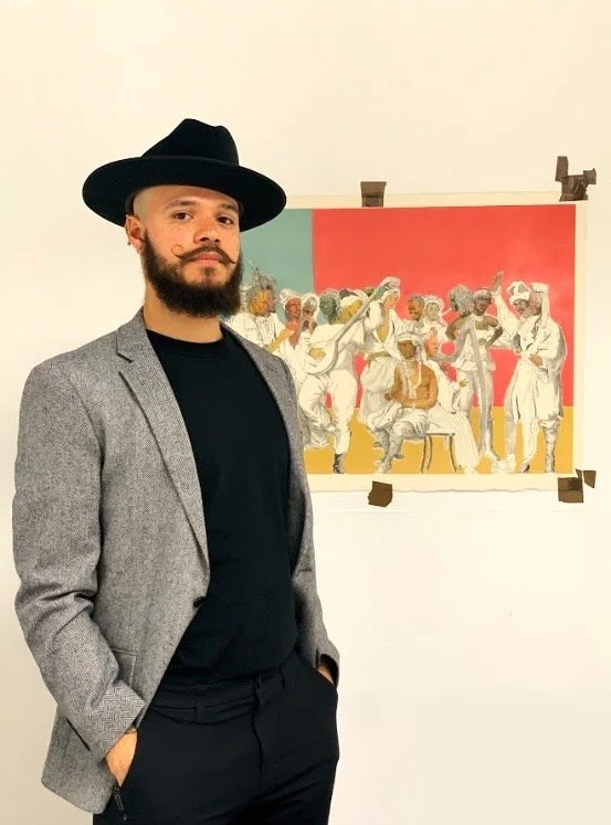 Rudolph Taylor is an artist and printmaker whose work expands on how classical representation can be used to show an increasingly global and multicultural world. Through the use of archives and utilising his skills as collaborative printmaker, Rudolph utilises collage and drawing to reinterpret classical western art to reflect the world today. Mixing up bodies with clothing and objects from across the world and centuries he depicts the complexity of being multiracial, while also creating a space in which these individuals can exist in the fullness of their multifaceted identities. Taylor’s recent works use lithography as a way to draw on the history of reproduction within printmaking, but through the manipulation of the imagery he creates scenes and environments outside of their time. While from a distance one might feel the work is recognisable, upon closer observation the complexities of Taylor’s world reveal themselves, subverting the original expectations. Taylor received his BFA in Studio Arts from Syracuse University in 2019, where he concentrated in printmaking and received the Bruce Manwaring Printmakers Award. He then went on to complete the Tamarind Printer Training program in 2022, and soon after worked as a collaborative printmaker at Paulson Fontaine Press in Berkeley, CA. He is currently pursuing his MA in Print at the Royal College of Art. Taylor has exhibited work all over the United States and has worked on projects that are housed in archives in New York, New Mexico, and California.