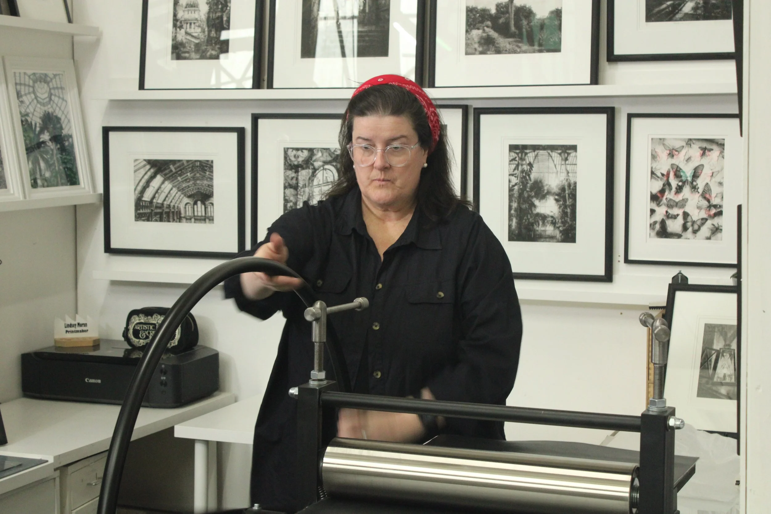 I share a studio in Liverpool, so I'm self-sufficient in that I've got my own vacuum exposure and my own press. I work on the imagery in Photoshop then I take it to my iPad, where I really refine the imagery until it's at a stage where I'm happy with it. It is then printed onto acetate. This transparency is then used on photopolymer plates, which are light sensitive but very delicate plates. I use an Aquatint screen because you have to put a matrix across the whole plate otherwise it'll wash out in big areas. This is a technique you can use for relief prints. The transparency is then overlaid in the exposure unit and exposed a number of times. Once they are exposed, it's washed out in water, which is great because the bits that haven't been exposed remain soft and wash away. Then you dry the plate and cure it with more exposure to UV light. Once it's hardened, it prints as an intaglio plate through a traditional etching press. That's where you go from contemporary to the traditional processes and I like that fusion.