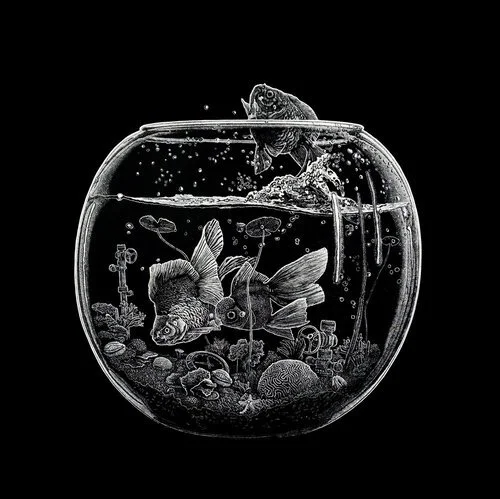 This process is just like woodcut but the material is much easier to carve using knives and gouges. The artist draws directly onto a layer of linoleum often mounted on a block of wood and then proceeds to cut away the areas around the design. This process is much easier than woodblock as not only is the material much softer to carve but here is no grain to take into account when carving.