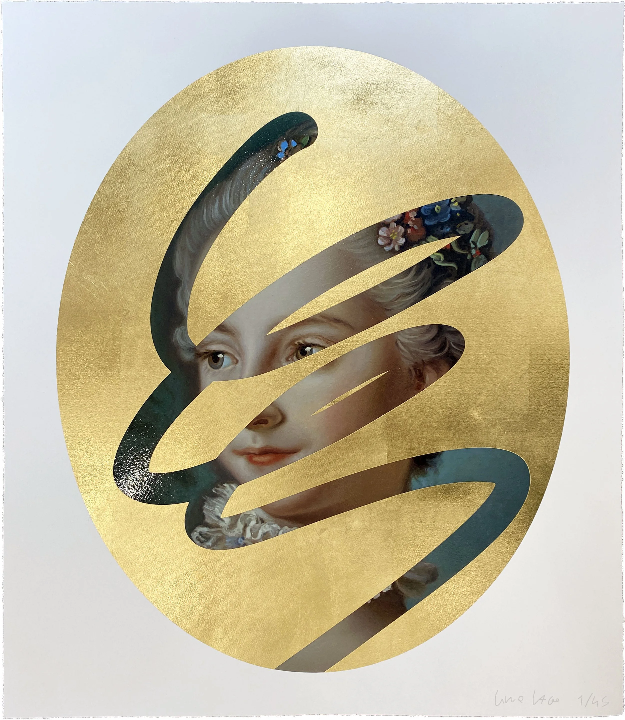 Lino Lago, Fake Abstract (Boucher) Gold, 2022, Archival pigment print with screen printed varnish detailing and faux gold leaf on Somerset Enhanced Velvet 330gsm with deckled edge, 75 x 65 cm, Edition of 45