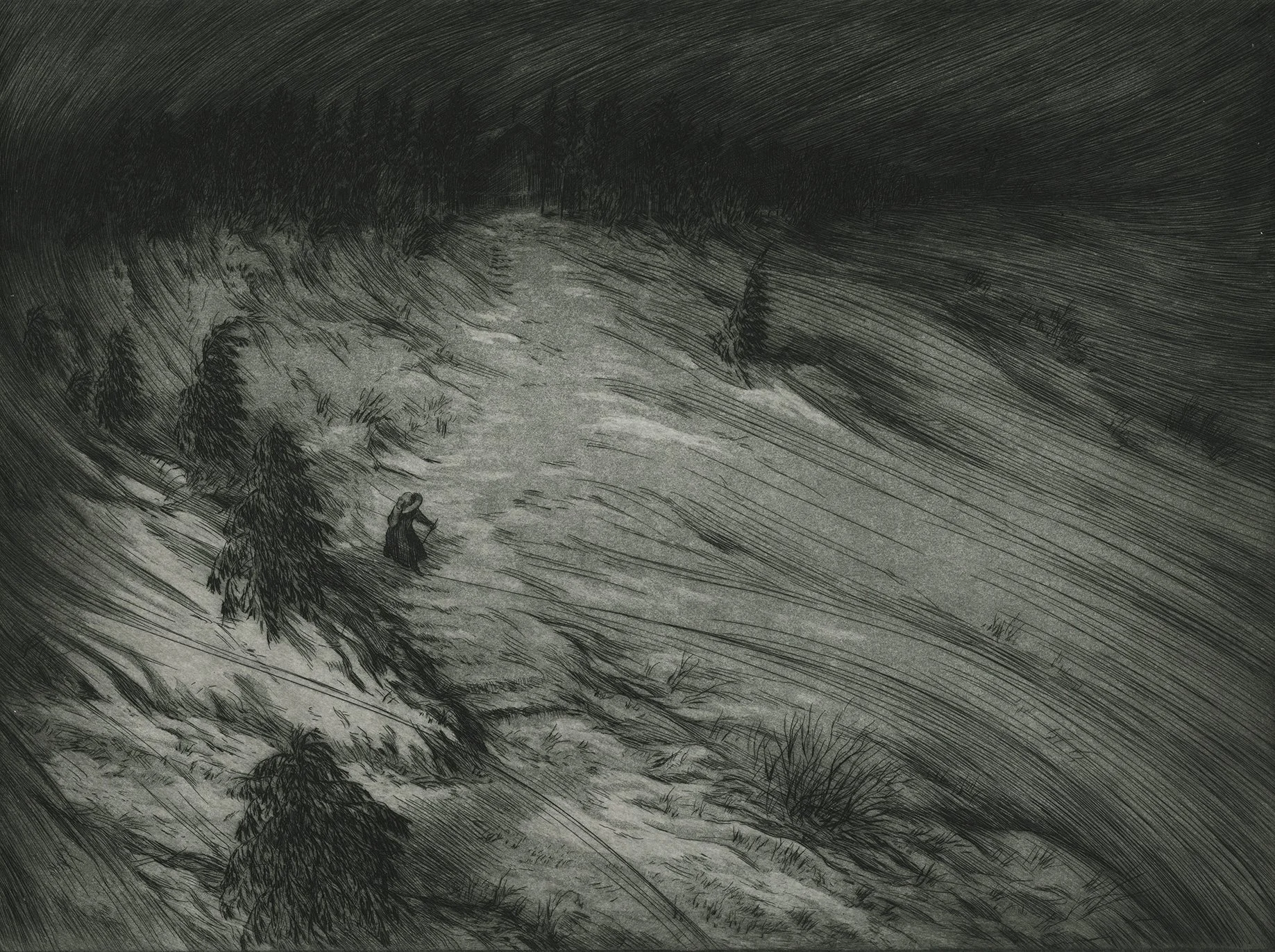 Die Wetterfahne (The Weathervane) is the second of the 24 songs of Franz Schubert’s Winterreise song cycle. The wanderer leaves home and love behind as he starts his solitary journey during a stormy winter night, believing the weathervane on top of the house to mock his departure and emotional turmoil. The song is one of the most energetic ones of the cycle, and the same goes for this illustration among all 24 pieces. Made on a 40 x 30 cm zinc plate with layers of line-etching and spray paint aquatints.